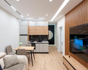 Los apartamentos cuentan con aire acondicionado y calefacción para garantizar una estancia confortable durante todo el año. Cada unidad dispone de balcón desde donde se puede contemplar el paisaje urbano. La cocina integrada está equipada con horno, placa eléctrica, nevera, hervidor eléctrico y tostadora para preparar comidas caseras sin complicaciones. Además, hay un espacio destinado al comedor junto a una sala con televisor plano compatible con plataformas digitales.