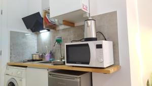 Goście mogą korzystać z aneksu kuchennego wyposażonego w mikrofalówkę, lodówkę, kuchenkę elektryczną oraz czajnik elektryczny i naczynia kuchenne. W pokoju znajduje się także biurko i pralka.